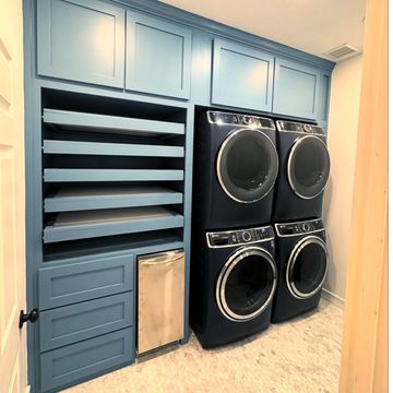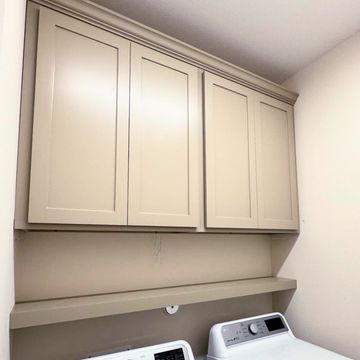 Custom exact fit dual cabinets with adjustable shelves and four doors with soft close hinges. Full length fixed lower shelf. Center washer/dryer divider cabinet with drawers.